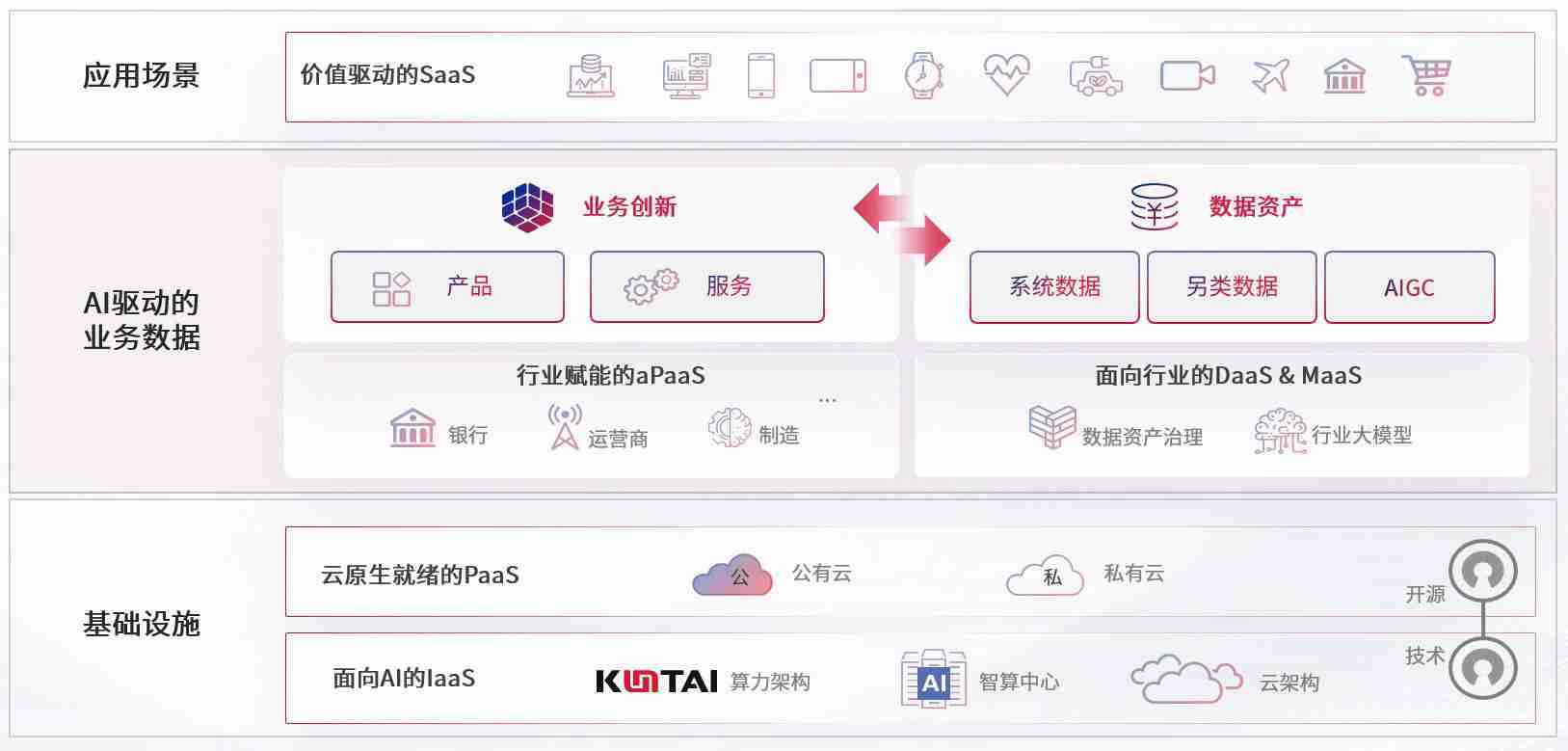 数字时代,,,围绕企业数字化转型的关键要素,,,,尊龙z6数码开创性的提出数云融合战略和技术体系框架,,着力在云原生、、数字原生、、、、AI原生和信创产业上架构产品和服务能力,,为处在不同数字化转型阶段的快消零售、、、汽车、、金融、、、、医疗、、政企、、教育、、、运营商等行业客户提供泛在的敏捷IT能力和融合的数据驱动能力,,构建跨界融合创新的数字业务场景和新业务模式,,助力企业级客户建立面向未来的核心能力和竞争优势,,,,全面推动社会的数字化、、智能化转型升级。。