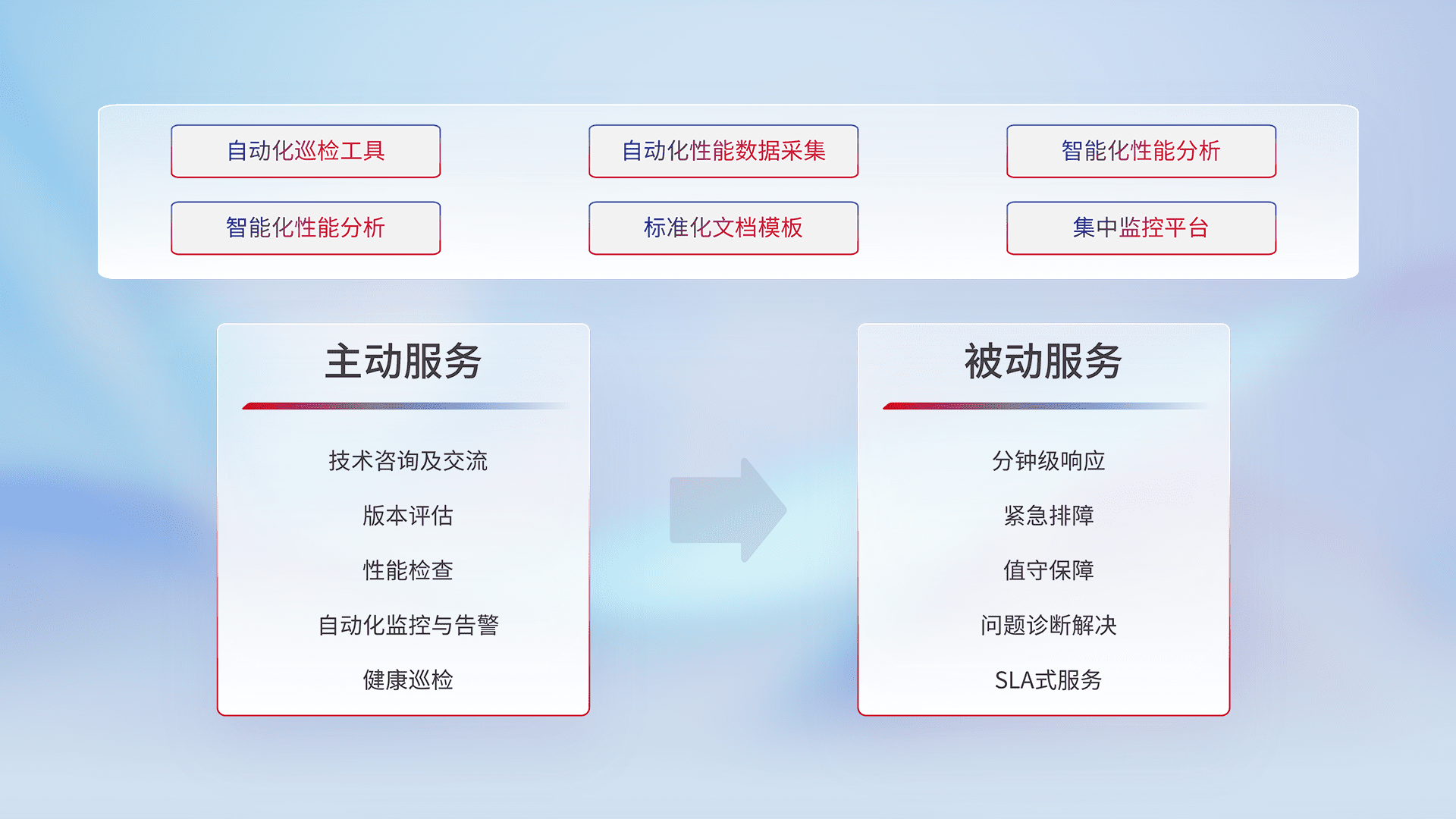 智能化工具和标准化文档,,,,保障服务质量,,,,提供主动服务(包含技术咨询、、版本评估、、、性能检查、、、自动化监控与告警、、健康巡检)和被动服务包含(分钟级响应、、、、紧急排障、、、值守保障、、、、问题诊断解决、、SLA服务)。。。。
